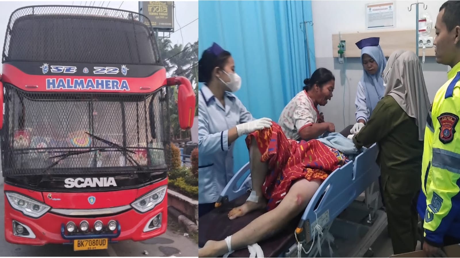 “Bagian depan sudut sebelah kanan dari Mobil Bus Scania Halmahera BK 7080 UD berbenturan dengan bagian tubuh pejalan kaki yang terpental ke kanan jalan dan berbenturan dengan bak samping sebelah kanan dari Mobil Truck Colt Diesel BK 8304 DQ yang datang dari arah berlawanan,” ungkap Aipda Kadri.